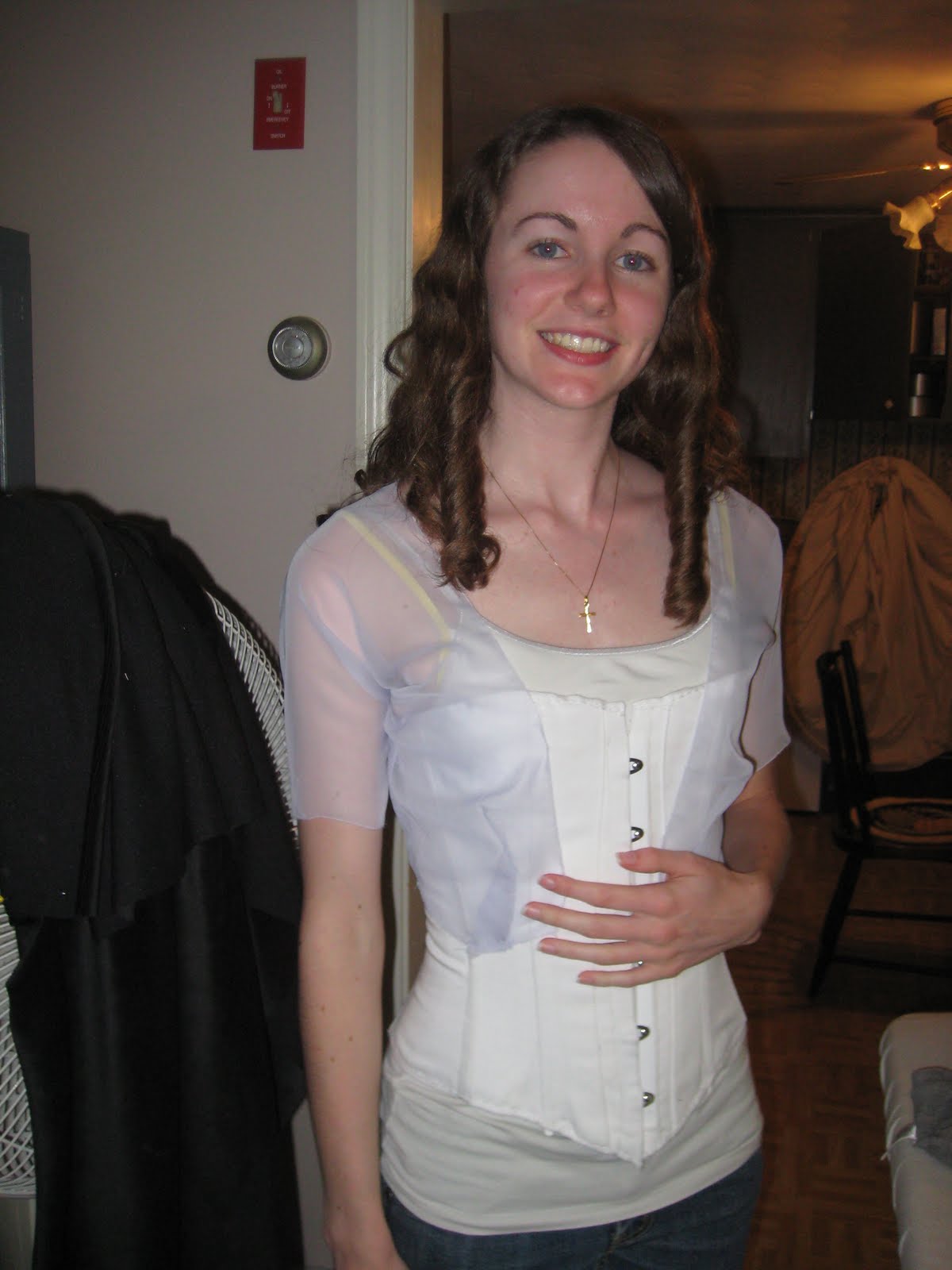 Meanwhile, I finished up my corset and cut into the sheer lavender fabric that makes up the bodice and sleeves of my dress. This under bodice project is still unsolidified in my mind. When I put my muslin of the straps under the bodice pieces, I decided it looked too awkward. My material is a little more see through the the original gown (either that or my strap fabric is a little more bright) but they look dreadfully obvious on mine. So for now I'm toying with the idea of scrapping them in favor of believable ascetics rather then accuracy. Which would of course mean redrafting again. Kat's and my adventures today took us back to Sew Low where I picked up some better fabric for the cream colored bits so maybe that will look less distracting anyway. I also got the purples for the two upper sashes. My plans for the rest of the week are to get this gosh darned bodice figured out!